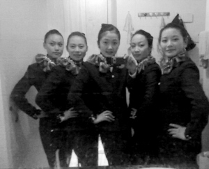 婷婷寝室6个女孩,站成一排,身高都在165厘米以上。她们穿上空姐制服,虽然脸上稍显稚嫩,不过也能以“假”乱真。这帮90后的女孩刚刚进大学,心思就蛮活络,不愿意光待在学校里啃书本,想找更多的实践机会。