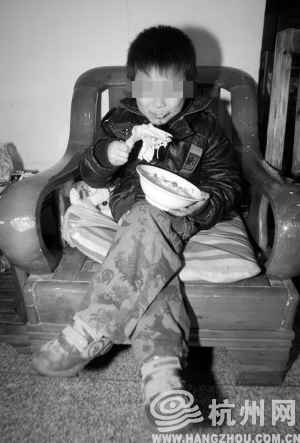 之后几天,男的每天都是一早出去,深更半夜才回来。小男孩一个人无聊,有时就到楼下前台玩一会儿,酒店搞卫生的阿姨发现他没饭吃,就从对面的餐馆里带碗饭、带些菜给他。