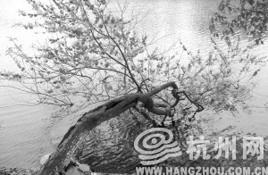 看到这张照片后,我去曲院风荷找这棵桃树。看了现场,发现它是一棵坚强的桃树:它的树干部分像是被开了膛,里头是空心的。桃树之所以没有倒下,是因为有一块大石头,支撑在树干下。一部分的枝头已经浸泡在水中,这些树枝上都是光秃秃的,没有叶子,更没有桃花,而在水面的树枝,则开满了桃花。