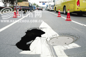 大洞的位置是在德胜快速路,自西向东方向距杭海路约400米处。凹陷处像一个大漏斗,窨井盖歪在一旁,洞口大四五平方米,深3米左右,还有不少裂纹沿洞口向周围延伸,长的有10米左右。