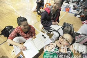 趁着中午休息的间隙,小朱趴在板凳上做物理作业。小朱在学军中学读高一,上午参加完大众操的比赛,吃过午饭做会作业,还要继续练习自编操,准备迎接下午2点的比赛。