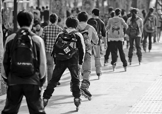 昨日,明媚的阳光受到了学生们的青睐。一支名为“66一族”的学生轮滑团队,排成一条长龙,游走在西湖边。