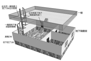 深挖储藏室的住户,就是在储藏室的顶上,打了一个两米见方的大洞,储藏室再深挖一米多。