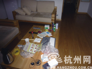 警方现场取证照片——客厅茶几上,杂乱地摆放着很多物品:感冒清颗粒、花露水、基隆便当广告、散装花生、一瓶五加皮(喝了一大半)、一次性纸杯、筷子、餐巾纸、烟灰缸、打火机、开水壶、电视耳机,还有一张杭州市区地图,摊开的一面,是钱江三桥,正是小偷入住的这套公寓附近……这张茶几,是方某一个多月“业主”生活最形象的见证。