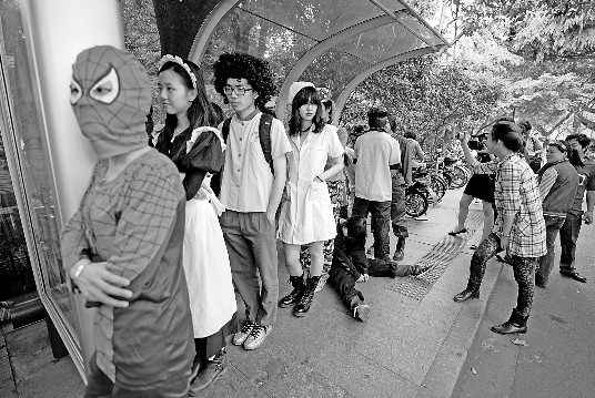 据了解,他们是中国美院的在校生。“蜘蛛侠”、“超人”、“罗宾”出现在等公交车的队伍中,还真是引人注目。