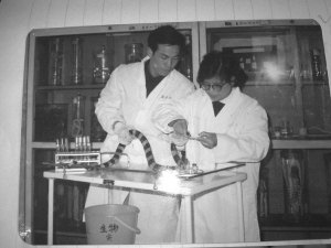 黄美华与杨友金老师在挤蛇毒(摄于上世纪80年代)