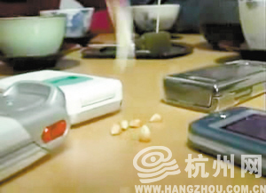 三名老外围坐在黑色茶几四周,4部手机围成一圈,圈内放几颗玉米粒。从手机拨通到玉米粒爆开,只花了5秒钟。