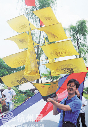 昨天下午,西湖白堤景区里出现了一只造型独特的大风筝。据一位风筝爱好者介绍,这只名叫“吉祥”号的船型风筝长1米,高2米,仿制古代的帆船造型而设计,正巧赶上端午节,添上龙凤图案放飞到天空,远远望去就像是艘大龙舟。