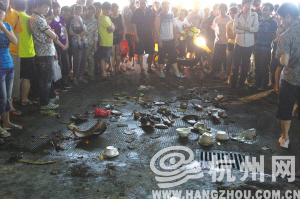 坛子鸡摊位已是满地碎片,还有被人踩烂的鸡。见习记者 江玥 摄