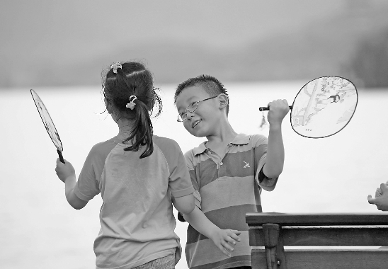 西湖边两个小伢儿,互相扇扇解暑气。