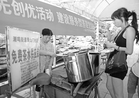 杭州潮鸣街道艮山门社区设立的免费茶水点的张奶奶说,今天已经有7大桶茶水送出了。天开始热了,来喝茶水的人也多了。最多的时候一天要送出10桶茶水。