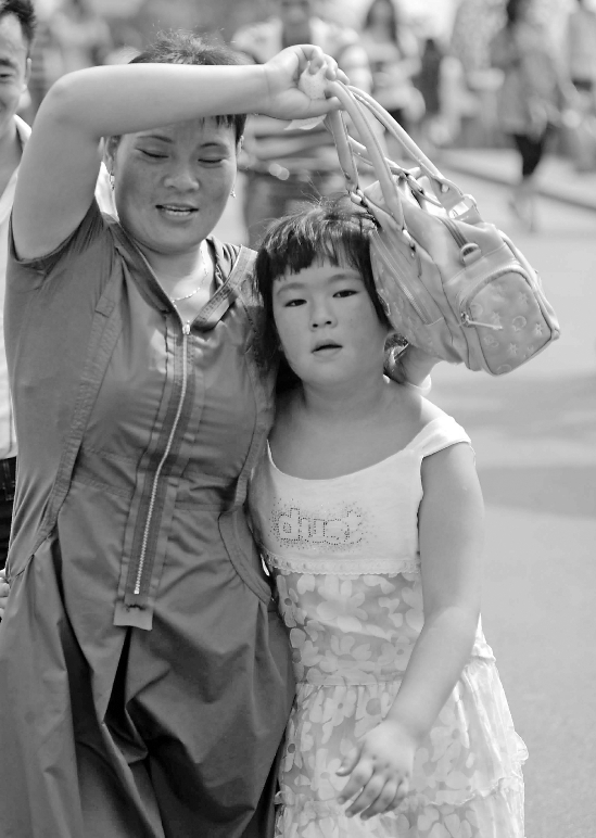 昨日中午,西湖白堤上,一位母亲用皮包给女儿挡着太阳,一路小跑到湖边的树下乘凉,瞧这小女孩的表情,都快热晕了。