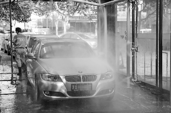 出梅了,杭州建国中路的一家洗车店生意又兴隆起来。店里的员工说梅雨的时候一天只有10多辆,今天已经洗了快200辆了。