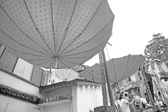 家住杭州元宝心社区的蒋大姐将雨伞高高挂起,除除湿气。接下来几天,也许用不上它们了。