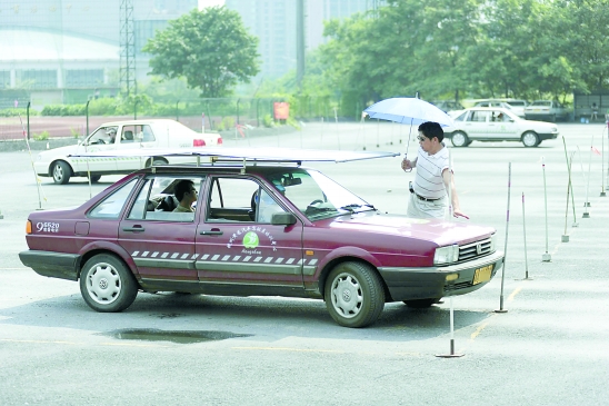 沈教练坐在树阴下,脸上包着一块半湿的毛巾。“不开空调,这也是没办法。倒桩是不踩油门的,全部用离合器控制车速,如果开空调的话,空调系统很容易坏掉。”