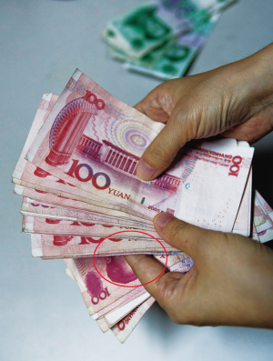 ②“嫌犯”一张一张翻看着钞票,佯装翻找2000年版时,悄悄把一叠钱夹进了左手食指和中指间。