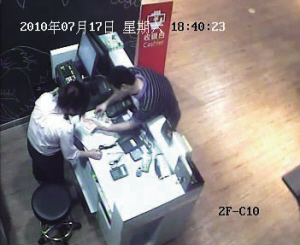 模拟人:记者两位,分别扮演女收银员、嫌犯。