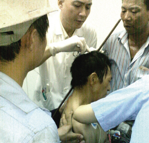 昨日10:20,一辆120救护车急急驶入浙江省立同德医院,担架抬下一个人来,急诊室的医生和护士着实被吓了一跳:一个男子头顶上插着一根直径1厘米左右的螺纹钢,钢筋贯穿脑部,后脑枕部处还露出一大截钢筋。这根长约70厘米的钢筋,使男子根本无法躺下,只能由随行来的工友扶着头和背部,欠着身子。