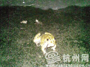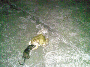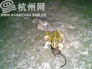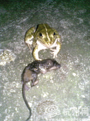 自述:昨天我家的青蛙把一只小老鼠吃下去了。真的!我住在一楼,不知道青蛙什么时候来的,已经10年了,冬天它就躲在土里,自己挖个洞钻进去。春雷第一声的时候就出来,晚上到处蹦,个子不大,就是一般的青蛙。