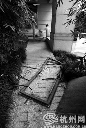 过去一看,原来是11幢3单元一户人家的一扇窗户掉下来了。窗户摔得粉身碎骨,二楼露台也被砸了个稀烂。还好,楼下没人经过。