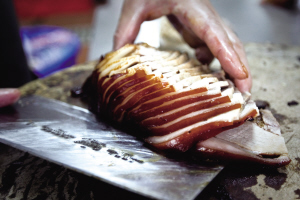 千层肉,从肉皮到肉尖几乎是一层肥一层瘦,咬起来藕断丝连的。“如果现在是晚上,喝杯小酒,那就神仙了。”一旁的摄影记者咽了咽口水说。