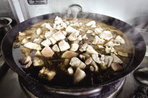 大师傅回答:“生肉是清晨五点送来的,我们7点半上班,第一件事就是把生肉切块,然后焯水,前后要花3个小时。”