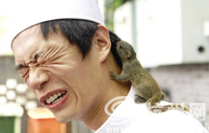 木之兰厨师跟小松鼠尽情玩耍 记者 韩丹 摄