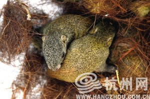 松鼠宝宝我们都是第一次看到,很稀奇的!当时,它们被摔得迷迷糊糊的,躺在窝里动也动不了。我想该不会摔死了吧?捧到手里,它们就慢慢清醒了,想逃跑。可当时快要下大雨了,这些小家伙都不知道断没断奶呢!能上哪儿去呀!有一只摔得还蛮重的,连路也不会走了……”
