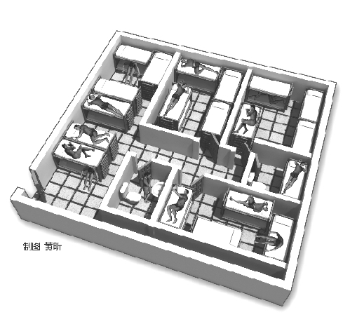 这是一套毛坯房,三室一厅的结构。客厅里,密密麻麻地摆下了7张高低床。