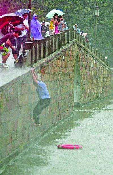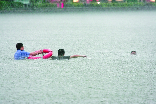 小冯(中)和民警(左)奋力游向跳湖男(右)。