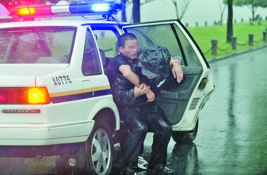 昨天下午,一位失意男子从断桥边跳入西湖自尽。滂沱大雨中,一位来自北京理工大学的大学生,冒雨跳入西湖,与闻讯赶到的岳庙派出所民警一起,将该男子救起。碰巧路过的本报摄影记者用镜头完整地记录了整个救人过程。