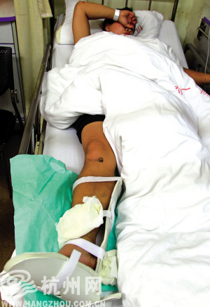 记者魏奋核实报道:市一医院骨科病房,一个看上去腰粗膀圆的小伙子,躺在病床上,他右脚被固定,脚踝上还敷着两个冰袋。