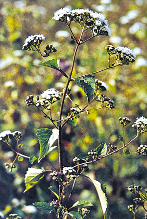 资料还说,2010年中国西南大旱后,紫茎泽兰疯长蔓延,威胁到农作物的生长,目前已被列入我国首批外来入侵物种,而且排在第一位。