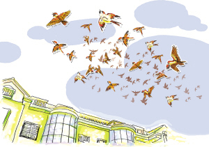 2009年11月21日,快报曾报道过:下午4点半左右,乐清的城郊接合部飞来成千上万只麻雀,它们在低空盘旋,不停地变换队形,据说是在抱团过冬。
