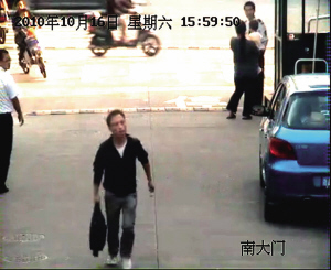 跆拳道馆门厅外的楼道监控显示,一个中年男子在跆拳道馆几次出入。商务大厦外的监控拍到,他从跆拳道馆出去后,右手提着电脑包,左手拿着很像车钥匙的东西,在楼下来回一路小跑。之后,跑出香樟公寓南大门,右转,跑出了监控区域……