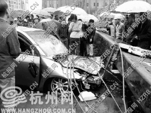原来,当时萧山市心北路新时代大酒店对面工地,一辆塔吊车在吊绿化树时,由于操作不当,塔吊倒了下来,砸中了小徐的车子。