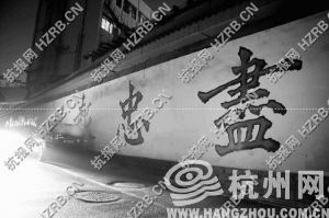 和平饭店西面打铁关路边的墙上画着岳飞像,还写着“尽忠报国”四个大字。记者 曾瑞阳 摄