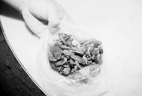东阳粗菜馆长生店的厨师张先生从操作间内,拿出一包用保鲜袋包装的东西。打开后,发现是几只已处理干净的小鸟,已分不清到底是麻雀还是山雀。