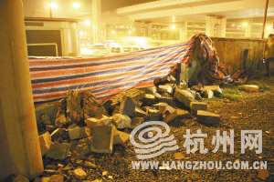 倒掉的围墙位于德胜路和石桥路交叉口,属于农都市场。围墙缺口长八九米,呈弧形。地上散落着不少空心砖,捡起一块掂了掂,蛮沉。