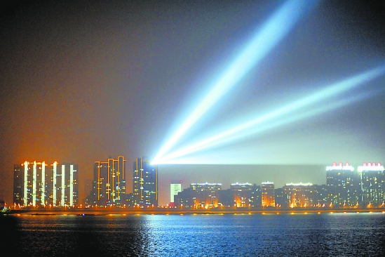 “从家里望出去很刺眼,而且对面高楼上的探照灯光柱会不停晃动,看了很头晕。”姚小姐拉上窗帘,可灯光非常具有穿透力,使得房间里就像调色盘似的,不停地变色,害得她一晚上没睡好。