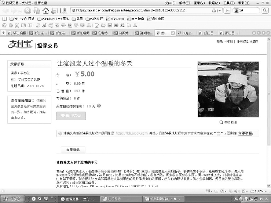 “我为老奶奶发起了一笔支付宝担保交易,每人用支付宝给我预捐5块、10块,最早打算凑足500块,我周末和同事去给老奶奶买一顶新帽、一件新棉袄和一床小棉被。”李亦兰告诉记者。