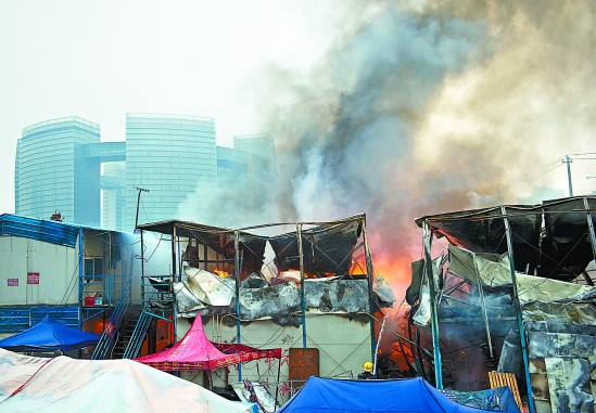 所幸当时工棚内的工友们都在施工现场,而住在工棚内的家属也及时跑了出来,没有人员伤亡。大火中,3幢工棚烧得只剩了1幢,一百多名工友霎时间无家可归了。