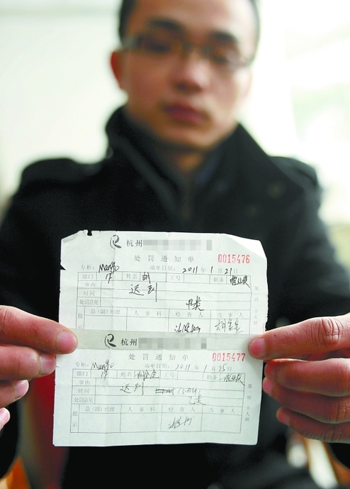小胡是杭州市区一知名商厦的专柜营业员,这份工作他也就干了20多天。1月21日早上,因故他迟到了10分钟左右时间,结果他就收到了营管员开具的一张“处罚通知单”。