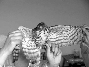 如果遇到受伤的松雀鹰,可以暂时养在安静点的地方,喂点活的小鸡、鸽子,一定要活的,才对它的口味。等它吃饱了,能站起来了,再放生。