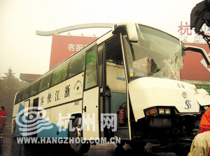 追尾的大客车车头严重损毁 读者 王小姐 拍摄