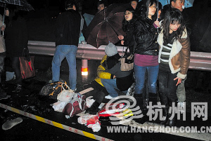 抢救室外,一个20多岁的女生,手里拿着单子,不停地在各个窗口跑来跑去,神情焦虑。她皮衣里白T恤领子和棕色丝袜上,留有不少血迹。女生姓张,1986年生,金华人,当天开着奇瑞,送男友父母回湖州老家,当时男友坐在副驾驶座上,男友父母坐后排。