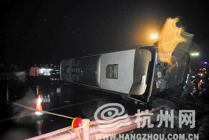 侧翻的沪牌照旅游大巴 通讯员 杨洋 摄