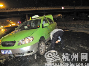 事发地点在艮秋立交桥由西往东车道,靠近隔离绿化带的那个车道上,到处是黑乎乎的烂泥和石块,被弄脏的路面约100多米长。一辆绿色丰田出租车车身横着,陷在泥里,车屁股有凹痕。旁边一个戴眼镜的中年男子脸上和白衣服沾满了泥巴,正用扳手拧螺丝,准备换下右前轮。