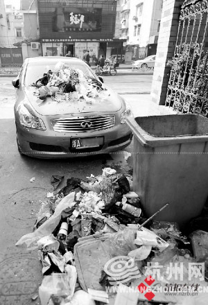 昨天上午,读者董先生打进热线:狮虎桥路38号,环卫工人因为车子挡道,垃圾没法清理,一怒之下把垃圾倒在了私家车上。