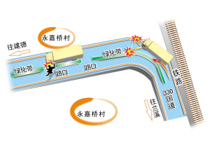 弯道幅度大 中央隔离带行道树过高,挡住路口行人视线 路面摩擦系数不够 导致这里事故多发 330国道永嘉桥村路段示意图